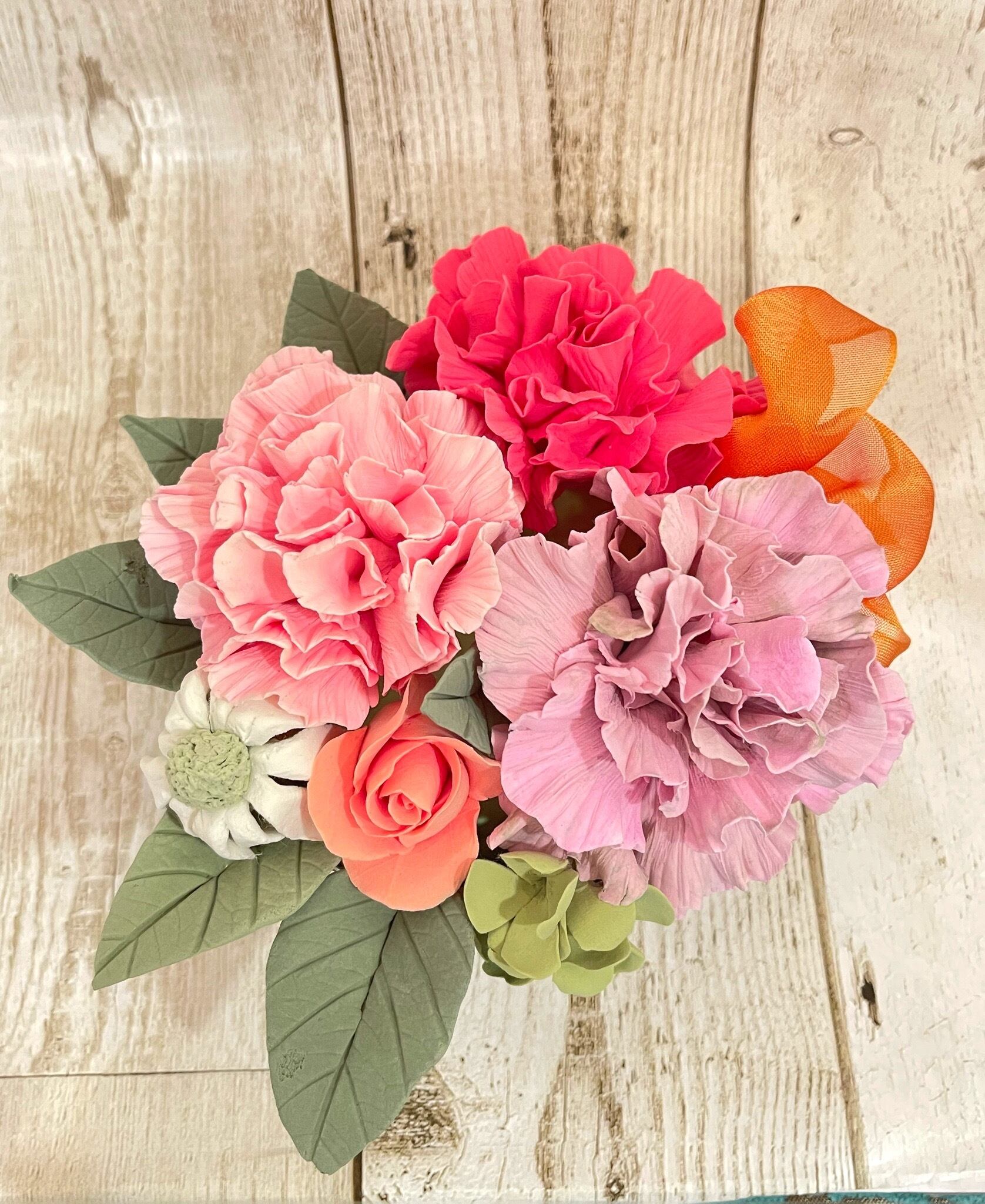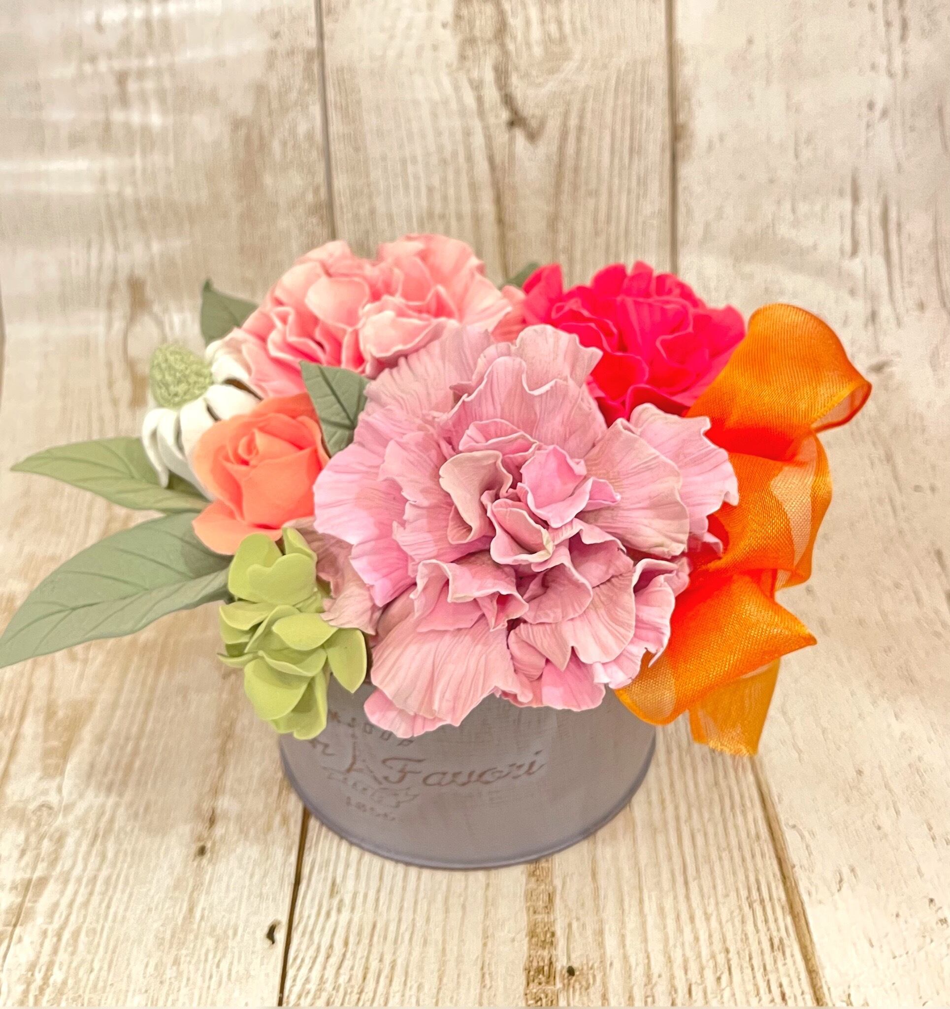sold out【ClayArt✖️ブリキのバケツ】 ピンクのカーネーションは感謝の気持ち♬を限りなく伝えてくれます。クレイフラワーだからこそ永遠の愛の形♬