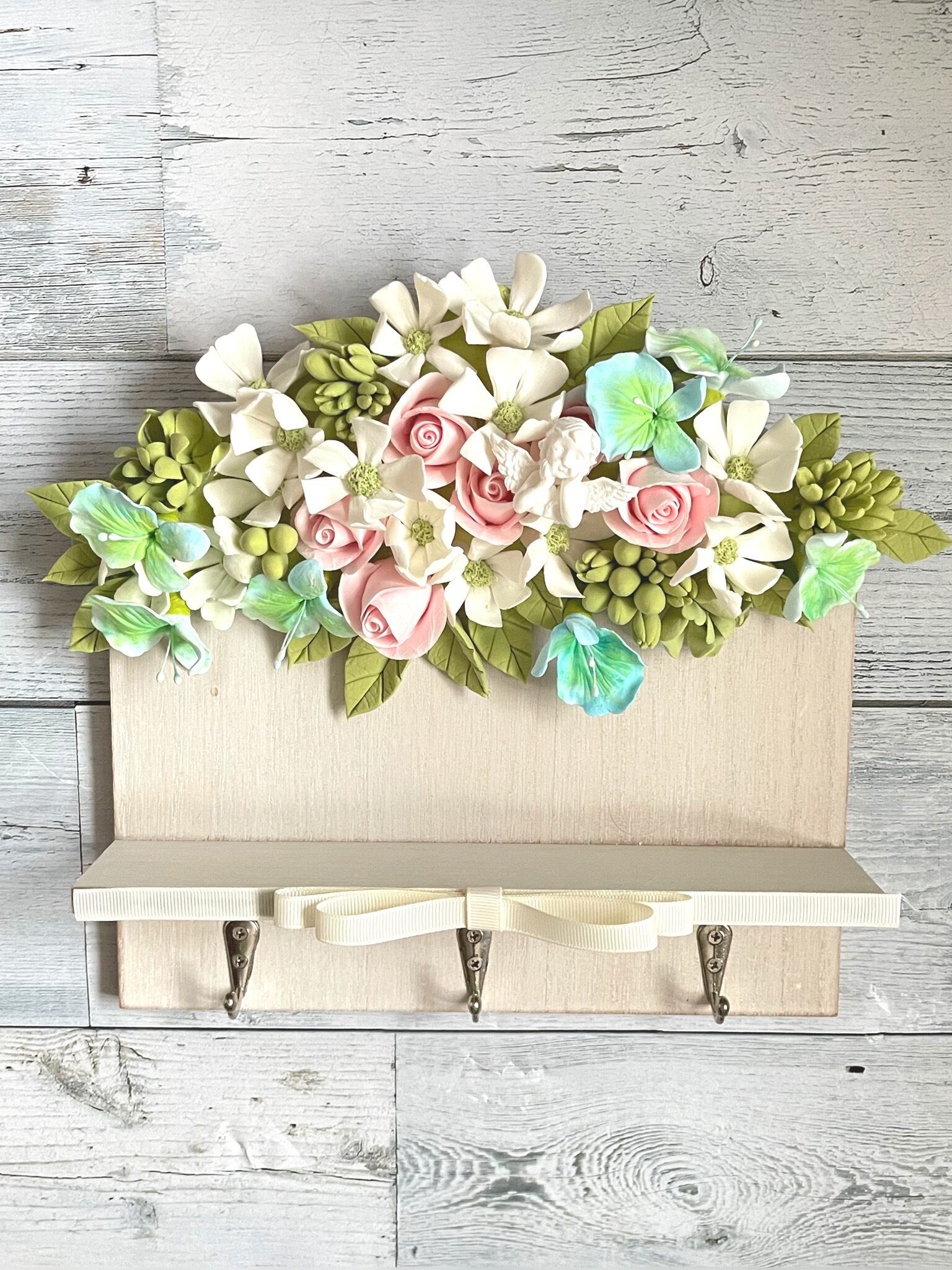 優しいベビーピンクと真っ白なマーガレットで彩るクレイフラワーのアレンジメントと実用性の高いKeyフックの