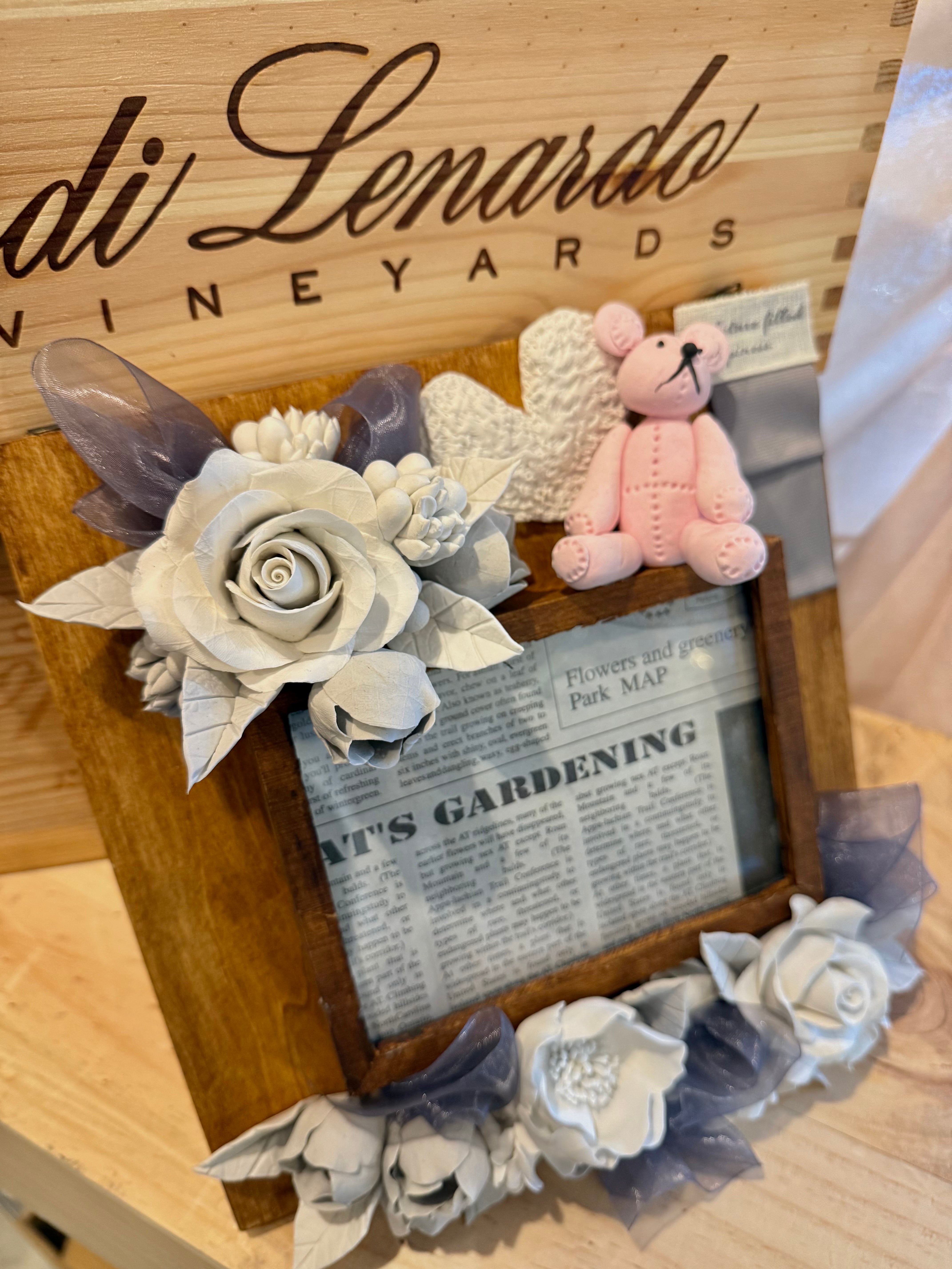 クレイアート*フレンチベアとクレイフラワーで彩るフレームアレンジメントのご紹介です。